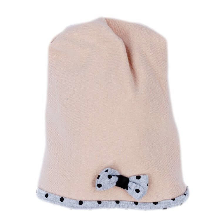 Bavlnená čiapka od výrobcu NICOL dvojvrstvová. Vrchná vrstva je púdrovo ružová, vnútorná svetlo sivá s čiernymi bodkami. Vpredu zdobená mašličkou.
