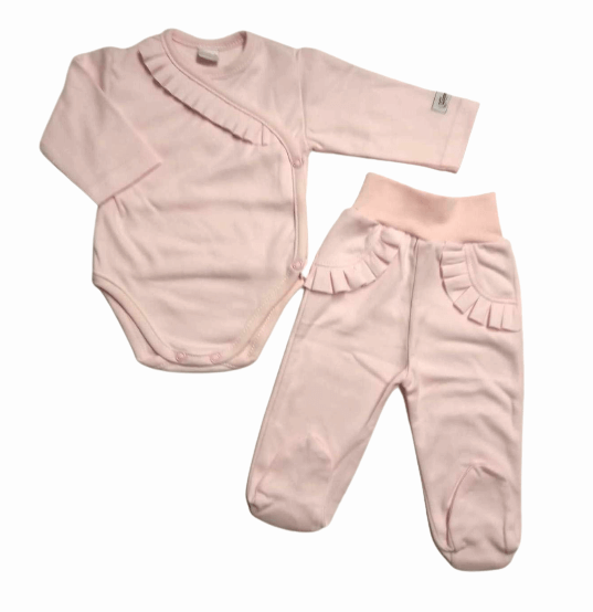 2 dielna súprava pre novorodenca svetlo ružová zdobená volánikom