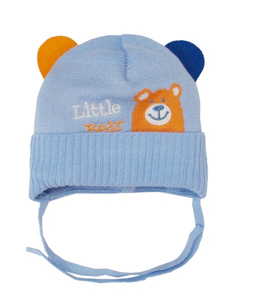 Bavlneno - akrylová čiapočka so zaväzovaním a uškami. Vpredu výšivka a vpletený medvedík.