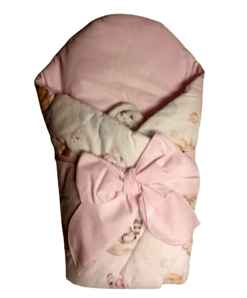 Vnútorná časť zavinovačky a mašľa je svetlo ružová. Vonkajšia časť je biela, potlač.